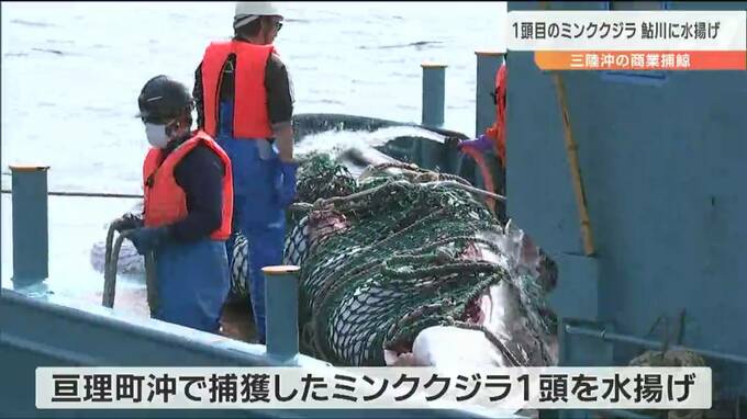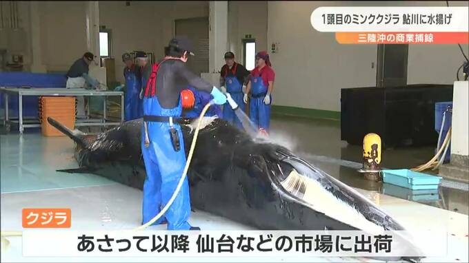15日から始まった三陸沖の商業捕鯨で、16日、1頭目となるミンククジラが捕獲され、宮城県石巻市の鮎川港に水揚げされました。かつて捕鯨基地として栄えた鮎川に、ミンククジラが水揚げされるのは2年ぶりです。