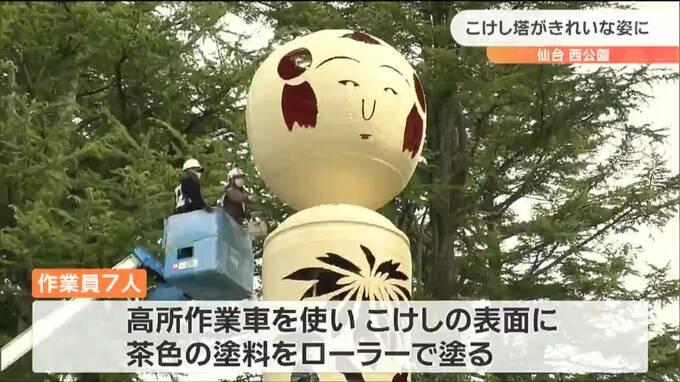 17日朝、青葉区の西公園ではこけし塔の塗装の仕上げ作業が行われました。作業員7人が高所作業車を使い、こけしの表面に茶色の塗料をローラーで丁寧に塗っていきました。