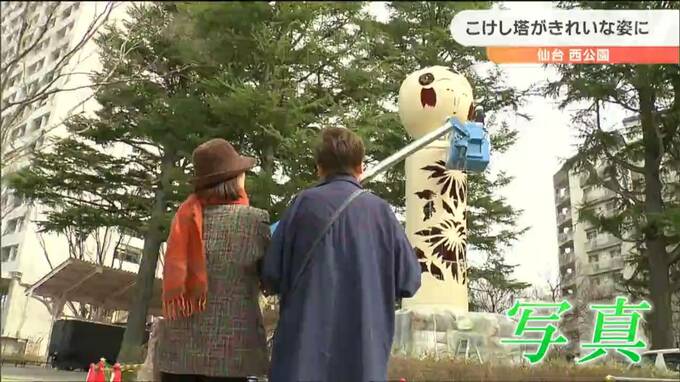 仙台市の西公園のこけし塔の塗り直し作業が17日終わり、公園のシンボルがきれいな姿に戻りました。