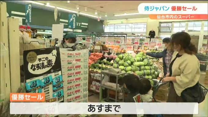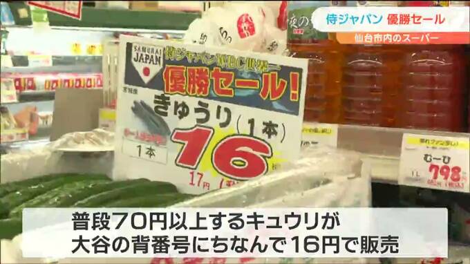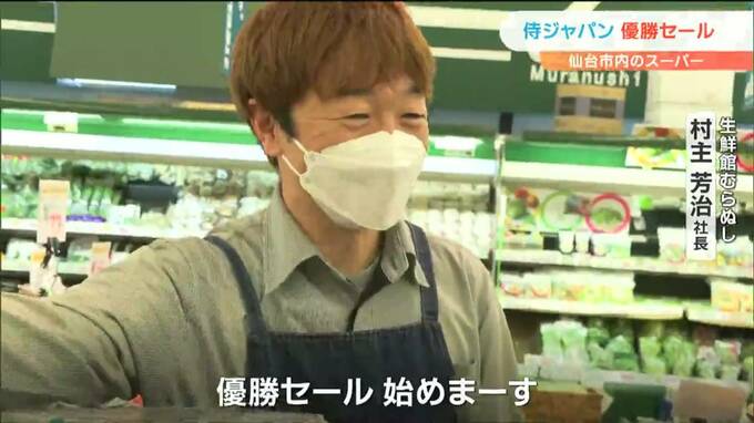 仙台市内のスーパーでは、侍ジャパンの世界一を祝って優勝セールが始まりました。