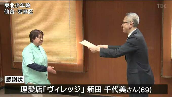 仙台市若林区にある東北少年院の山本宏一院長から感謝状を贈られたのは理髪店「ヴィレッジ」の新田千代美さん(69)です。