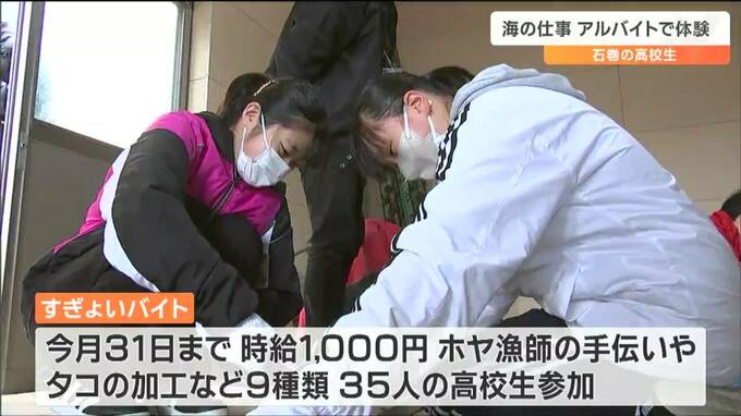 この「すぎょいバイト」は、今月31日までで、時給は1000円。ホヤ漁師の手伝いやタコの加工など、9種類の海の仕事が用意され、35人の高校生が参加します。