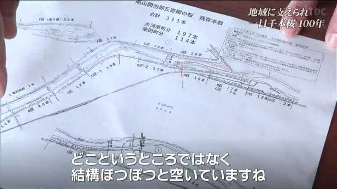 植樹から47年後、1970年に作られた開治郎のサクラの分布図です。開治郎が1200本植えたサクラは、護岸の開発で伐採が行われたうえ、自然に枯れるなどして、およそ430本にまで数を減らしていました。白石川沿いには古木の切り株が至るところに残っています。