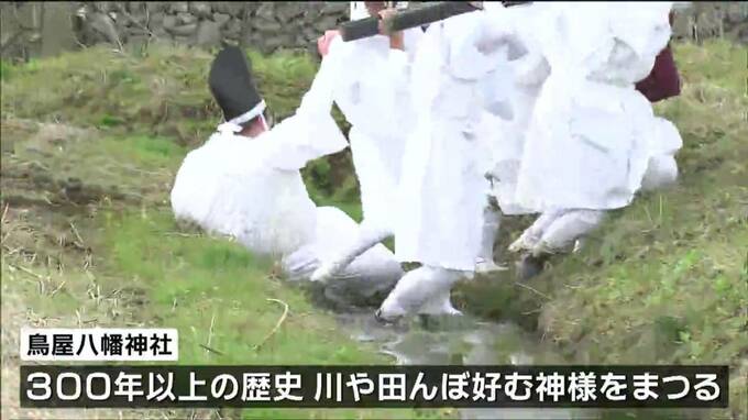 鳥屋八幡神社は300年以上の歴史があり川や田んぼを好む神様をまつっていて氏子らは田んぼなどに入り土を踏みしめて五穀豊穣や地域の安全を祈願しました。