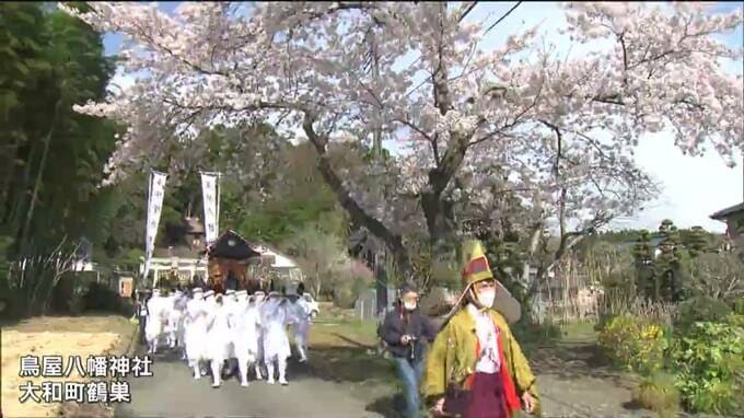 大和町の神社で9日、春の例大祭が8年ぶりに行われ、ご神体を乗せた神輿が地域を練り歩いて五穀豊穣など願いました。