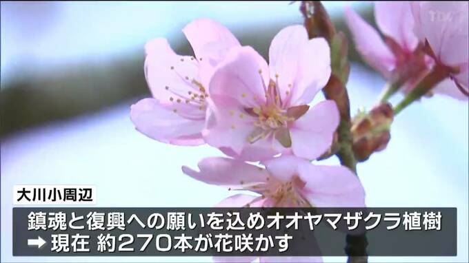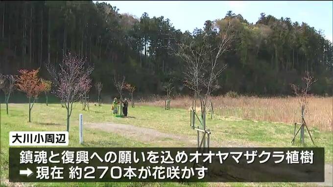 大川小の周辺では、震災の年の秋から、鎮魂と復興への願いを込めたオオヤマザクラの植樹が行なわれ、現在は、およそ270本が花を咲かせています。