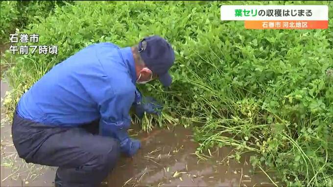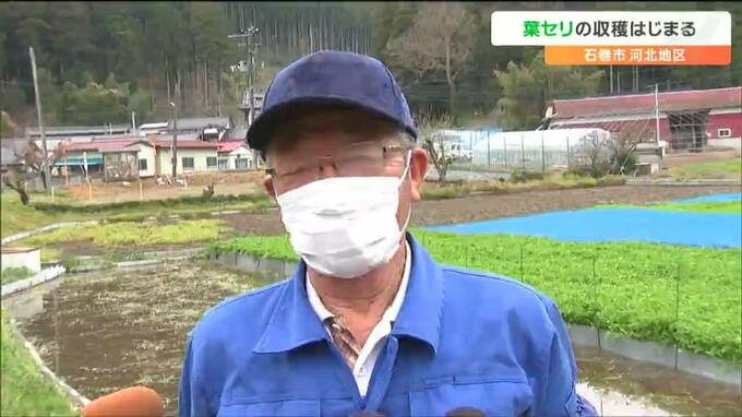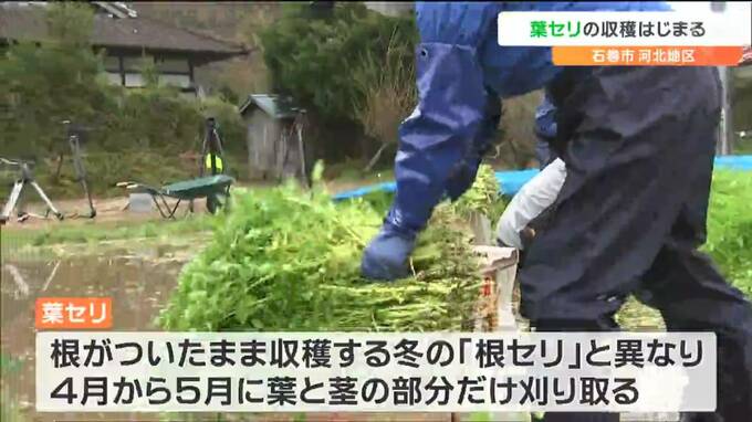 宮城県石巻市の河北地区で、春に刈り取るセリ、「葉セリ」の収穫が始まり、農家の人たちが出荷作業に追われています。