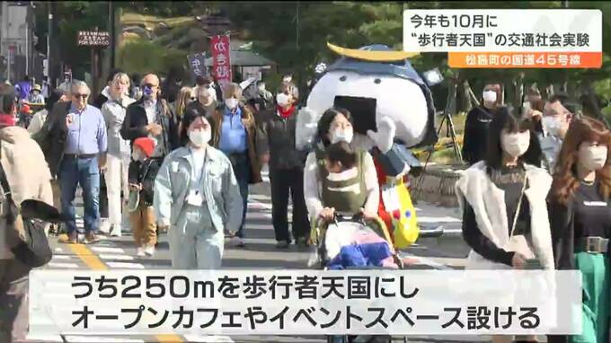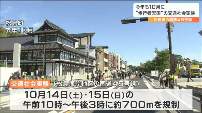 交通社会実験が行われるのは、松島町の松島海岸地区を通る国道45号線で、10月14日土曜日と15日日曜日の午前10時から午後3時まで、およそ700メートルの区間を規制します。
