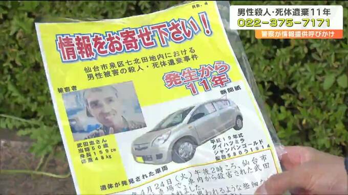「皆さんの情報が事件解決の糸口になる」“焼けた車から男性遺体”未解決事件から11年“県警が情報提供呼びかけ” 仙台 2023年4月24日(月) 15:40 国内 2012年に仙台市内の病院の駐車場で、焼けた車の中から殺害された男性の遺体が見つかった事件は、未解決のまま24日で11年です。警察は現場の最寄り駅で情報提供を呼びかけました。仙台市地下鉄泉中央駅では、24日朝…
