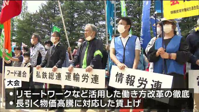 大会では、リモートワークなどを活用した働き方改革の徹底や長引く物価高騰に対応した賃上げを訴えました。