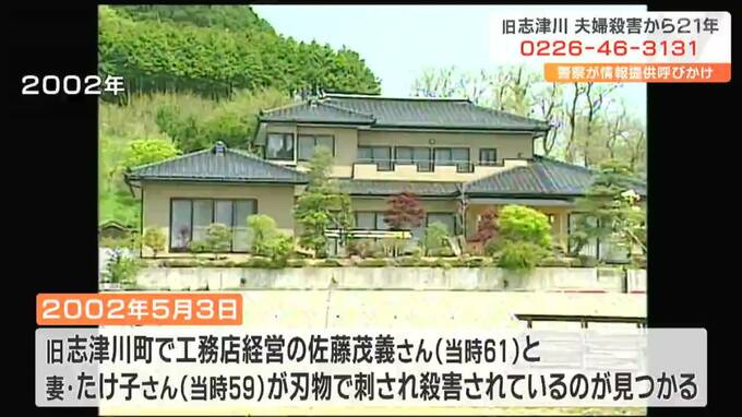 この事件は、2002年5月3日、旧志津川町で工務店を経営していた佐藤茂義さん(当時61歳)と妻・たけ子さん(当時59歳)が自宅で何者かに刃物で刺され殺害されているのが見つかったものです。警察はこれまでにのべ8万2500人を動員して捜査を続けていますが有力な情報はなくいまだ犯人逮捕に至っていません。