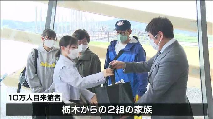 南三陸町の「南三陸311メモリアル」では6日、10万人目となった栃木からの2組の家族に、缶詰など災害用の備蓄品や記念品が贈られました。