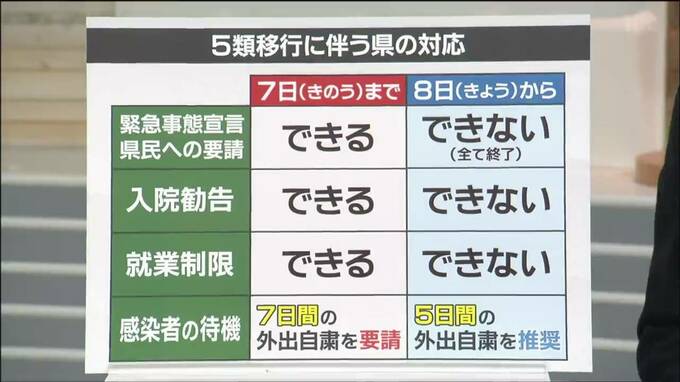 宮城県の対応をまとめました。まずは「行動制限」について、緊急事態宣言や県民への要請、入院勧告、就業制限は全てできなくなります。また、感染者の待機期間もこれまでは「7日間の外出自粛要請」としていましたが、「5日間の外出自粛を推奨」と改められました。