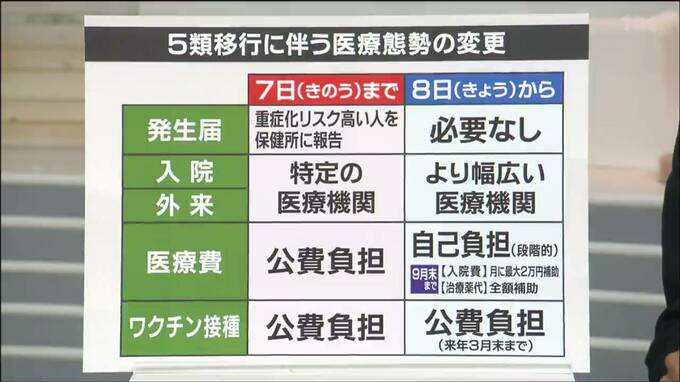 医師は重症化リスクの高い感染者について発生の届け出を保健所に出さなければなりませんでしたが、必要なくなります。また、入院患者は原則、感染症指定医療機関が受け入れ、外来も特定の医療機関で診療や検査が行われてきましたが、今後は、より幅広い医療機関に拡大されることになります。県は、最終的には全ての医療機関で入院や外来診療ができるよう支援するとしていますが、医療関係者からは不安の声も聞かれます。