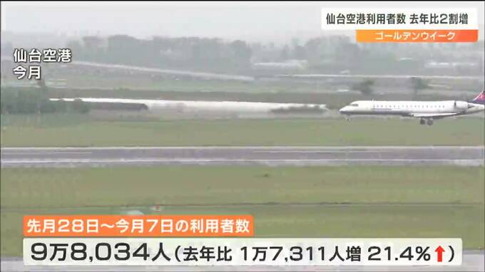 仙台国際空港によりますと、4月28日から5月7日までの10日間に仙台空港を利用した人の数は9万8034人で、去年の同じ時期と比べ1万7311人、21.4%増えました。