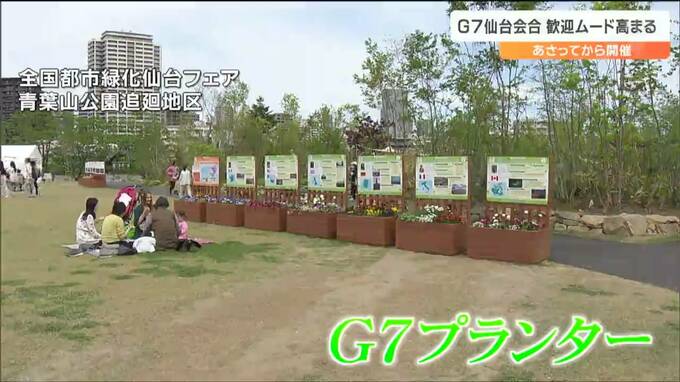 緑化フェアのメイン会場には、「G7プランター」が登場。色鮮やかな花々とともに参加国の紹介パネルが展示されています。