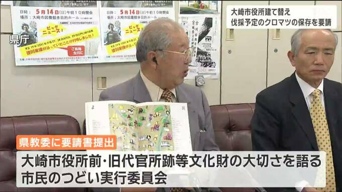 宮城県大崎市が市役所の建て替えに伴って、樹齢350年以上のクロマツを伐採しようとしていることについて、市民団体が11日、県教育委員会にクロマツの保存を求める要請を行いました。