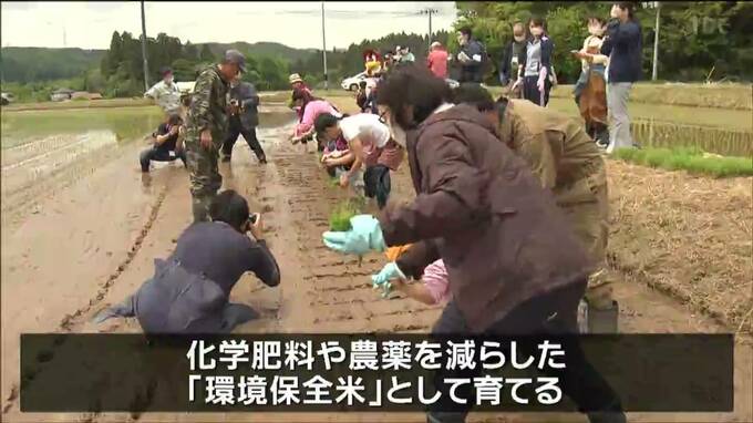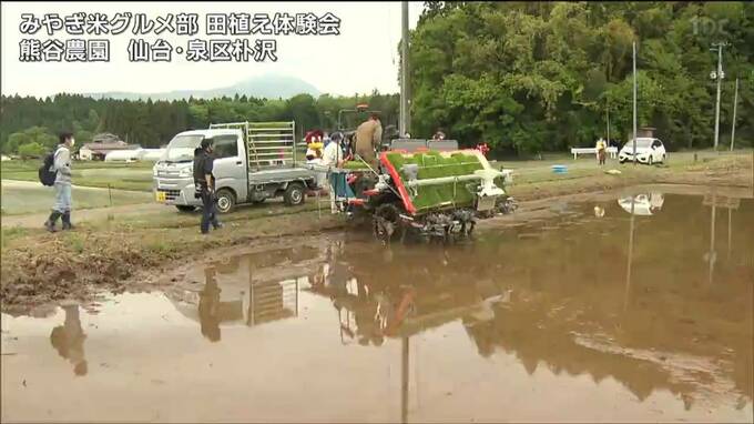 仙台市泉区朴沢にある熊谷農園の田んぼで行われた体験会には、家族連れなど7組が参加し、農家の指導を受けながら田植えに挑戦しました。