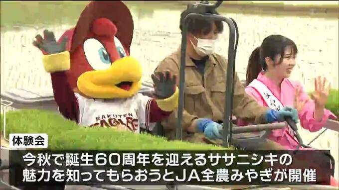誕生60周年を迎える県のブランド米「ササニシキ」の田植え体験会が13日、仙台で行われました。