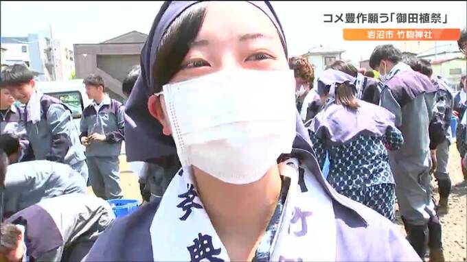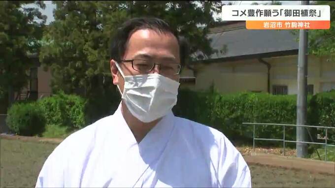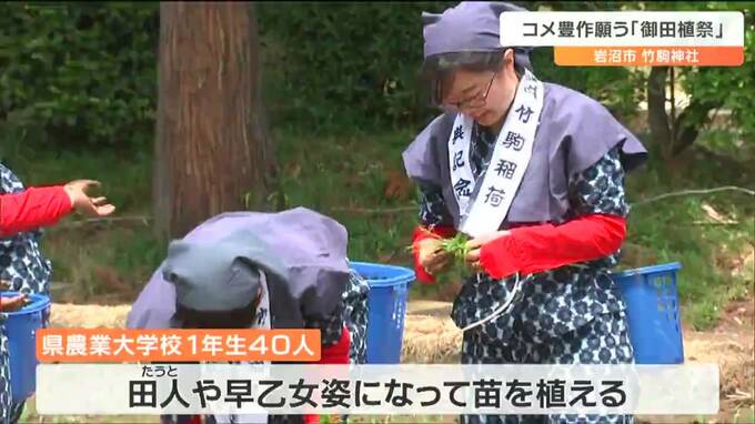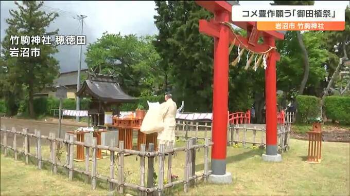 今年のコメの豊作を願う伝統の儀式「御田植祭(おたうえさい)」が、16日、宮城県岩沼市の竹駒神社で行われました。竹駒神社の境内にある穂徳田で行われた御田植祭には、神社の職員らおよそ50人が参列しました。神事では、今年のコメの豊作を祈願しました。
