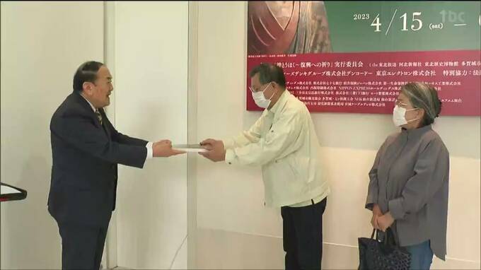 宮城県多賀城市で開かれている貴重な仏像などを集めた「奈良・東北のみほとけ展」で来場者が3万人を突破し、記念のセレモニーが開かれました。また、23日から日本最古の刺繍の展示が始まりました。