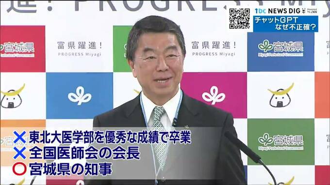 「『東北大学医学部を優秀な成績で卒業して、全国医師会の会長を務め、宮城県の知事をやっている』とそんなことが出てきた。ちょっと間違えている。だいぶ間違えているということなので、チャットGPTだけを信じて仕事をしてはいけないなと思います」