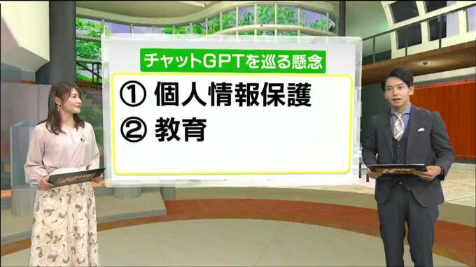 チャットGPTを巡っては、様々な懸念が指摘されています。こちらをご覧ください。ひとつめ、個人情報の観点です。チャットGPTは、膨大な数の利用者が打ち込んだデータを文章生成に利用していると言われています。熊谷さんが個人情報を打ち込んだら、それがほかの人のチャットに出てくる可能性もゼロではないということです!個人情報保護に敏感な欧米で特に問題視されています。