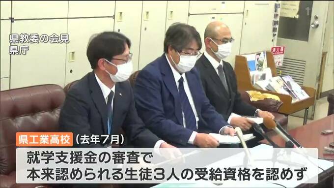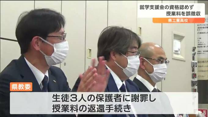 県教委によりますと、県工業高校が去年7月に行った就学支援金の審査で、本来は認められる生徒3人の受給資格を認めませんでした。この結果、生徒3人から授業料、合わせて30万4200円を徴収していたということです。