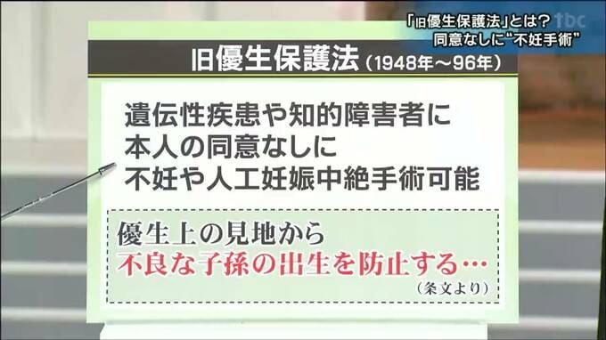 1948年から1996年まで存在した法律で、遺伝性の疾患や知的障害がある人には、医師が必要と判断し県の審査会が認めれば、本人の同意なしに不妊や中絶の手術ができるとされていました。全国で少なくとも2万5000人の被害者がいるとされています。目的は「不良な子孫の出生を防止する」と記されていて、障害の有無などで人に優劣をつけていました。「優生思想」という誤った考え方です。
