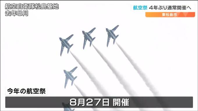ブルーインパルス飛行「航空祭」8月27日に松島基地で4年ぶり通常開催へ 宮城 2023年6月2日(金) 14:13 国内 宮城県東松島市の航空自衛隊松島基地で毎年夏に行なわれる「航空祭」は、今年は入場者数を制限せず、4年ぶりに通常規模で開催されることになりました。これは、松島基地が2日発表したもので、今年の「航空祭」は8月…