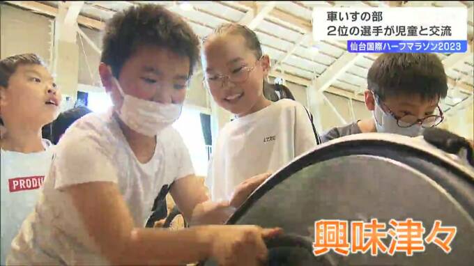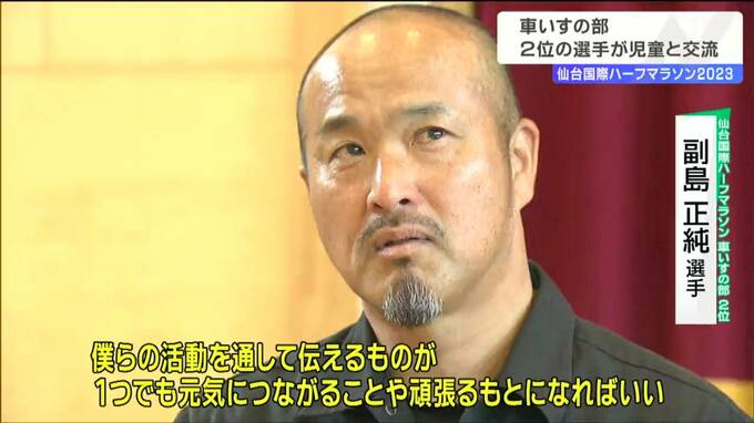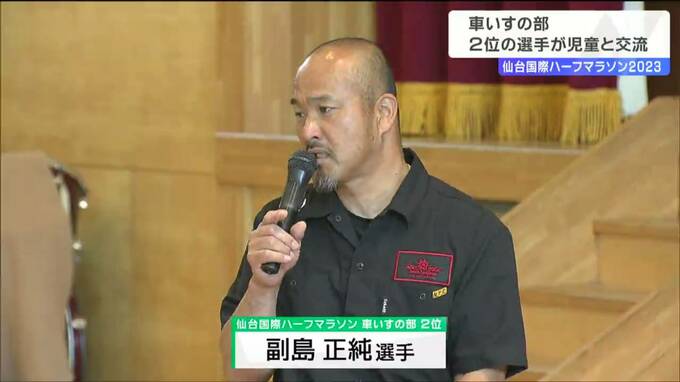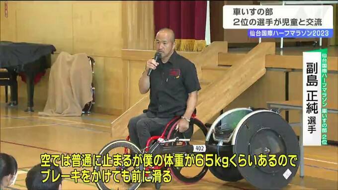 仙台国際ハーフマラソン大会車いすの部で2位になった副島正純選手が5日、仙台市内の小学校を訪れ児童と交流しました。