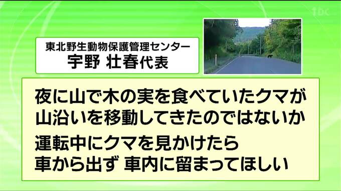 東北野生動物保護管理センターの宇野壮春代表によりますと、「夜に山で木の実を食べていたクマが山沿いを移動してきたのではないか。