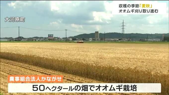 一面、黄金色のオオムギ畑。去年11月にまいた種は、順調に生育が進み、収穫の季節「麦秋」を迎えました。大河原町の「農事組合法人かながせ」では、50ヘクタールの畑でオオムギを栽培していて、6日も機械を使って刈り取りを進めていました。