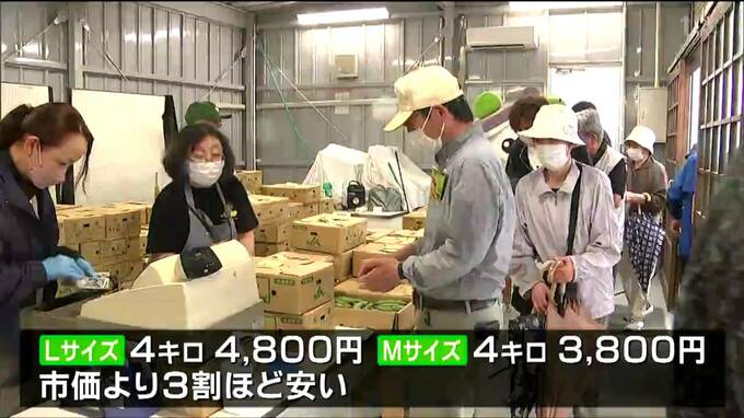 道の駅村田で始まった恒例のまつりには、とれたてのソラマメが運び込まれました。Lサイズ4キロで4800円、Mサイズ4キロで3800円と、市価より3割ほど安く、多くの人が買い求めていました。