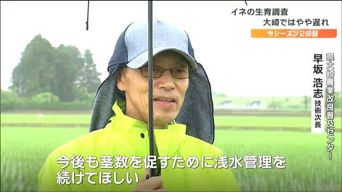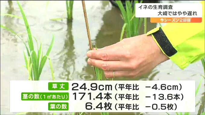今シーズン2回目のイネの生育調査が9日、宮城県内各地の水田で行われ、大崎市内では生育が平年よりやや遅れていることが確認されました。