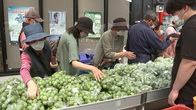 ウメの産地として知られる宮城県角田市で、もぎたての青梅を販売する催しが10日から始まり、大勢の人でにぎわっています。