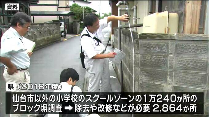 県は2018年度、仙台市以外の市町村にある小学校のスクールゾーンを対象に1万240か所のブロック塀の状態を調査し、その結果、除去や改修などが必要と判定されたブロック塀が2864か所確認されました。