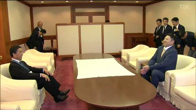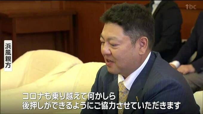 「五城楼」のしこ名で活躍した仙台出身の元力士「浜風親方」が村井知事のもとを訪れ8月に仙台で開催される夏の巡業をPRしました。