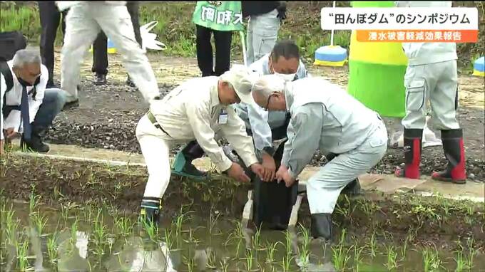 田んぼに水を貯めて浸水被害を軽減させる「田んぼダム」のシンポジウムが12日、宮城県大和町で開かれその効果が報告されました。