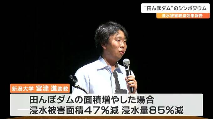 シンポジウムでは新潟大学の宮津進助教が大崎市内で行った検証の結果、田んぼダムの面積を増やした場合、浸水被害面積が47%、浸水量が85%といずれも減少し、大きな効果が得られたことを報告しました。