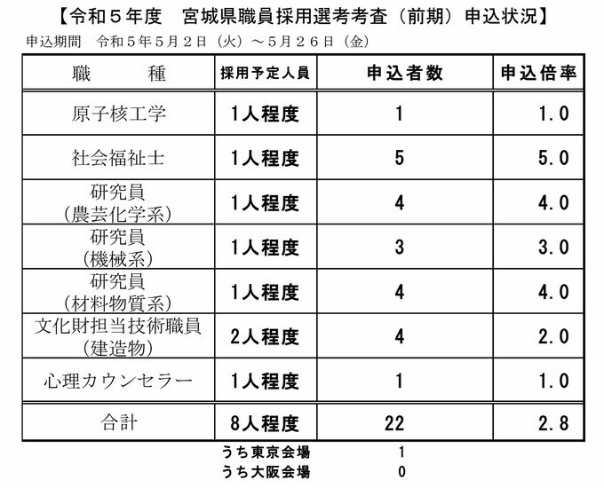 県職員採用試験の第一次試験は、6月18日(日)午前10時から、仙台・東京・大阪の3会場で行われます。