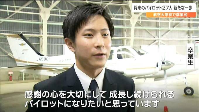 卒業を迎えた27人は、航空大学校の仙台分校や宮崎県にある本校などで3年2ヶ月の間、航空機の操縦の知識や技能を学びました。