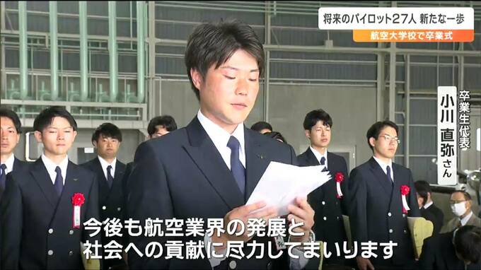 岩沼市の航空大学校仙台分校で行われた卒業式には、25歳から29歳までの27人が出席しました。式では、1人1人に卒業証書が手渡され、卒業生を代表して小川直弥さんが決意の言葉を述べました。