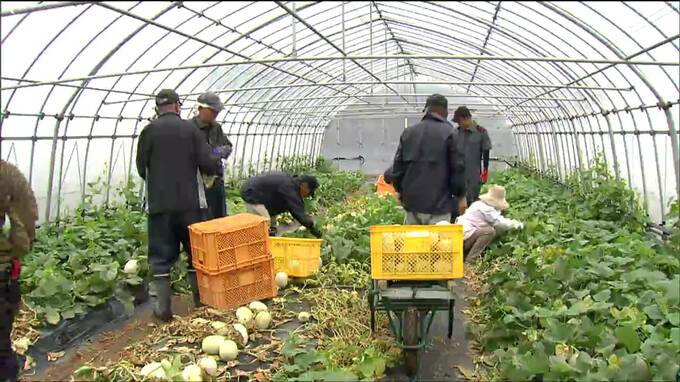 岩沼市押分のビニールハウスでは、16日午前6時から、クールボジャメロンの収穫作業が行われました。クールボジャメロンは、栽培が難しく国内では岩沼市と名取市でのみ生産されており「幻のメロン」とも言われています。大きさは直径12センチ前後で、表面は白くつるんとしています。甘みが強く、メロン特有のえぐみが少ないことが特徴です。1970年代から続けられてきたクールボジャメロンの生産は、農家の高齢化に伴い継続が危ぶまれていましたが、今年からは指導を受けた農事組合法人が受け継ぎました。