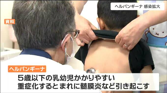 「ヘルパンギーナ」は40度近い発熱や喉の痛みが特徴で口の中に水ぶくれのような発疹ができる夏にかけて流行する感染症です。特に5歳以下の乳幼児にかかりやすいとされ、重症化すると、まれに髄膜炎などを引き起こす可能性もあるということです。