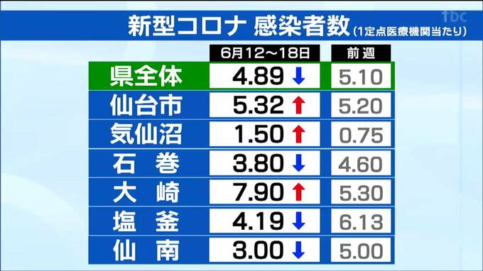今月12日から18日までの新型コロナの感染者数は、県内91か所の定点医療機関で合わせて445人と前の週に比べ19人減りました。1医療機関あたりの平均の感染者数は県全体で4.89人で、前の週に比べ0.21人減りました。保健所別では、仙台市で5.32人、気仙沼で1.5人、石巻で3.8人、大崎で7.9人、塩釜で4.19人、仙南で3人となっています。