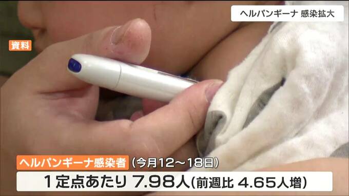 一方、乳幼児がかかる代表的な夏かぜ、「ヘルパンギーナ」の感染は広がっていて県は、県内全域に警報を出しています。県によりますと、今月12日から18日に新たに「ヘルパンギーナ」と診断されたのは1定点医療機関あたり7.98人で、前の週に比べ4.65人増え基準値の6人を越えています。