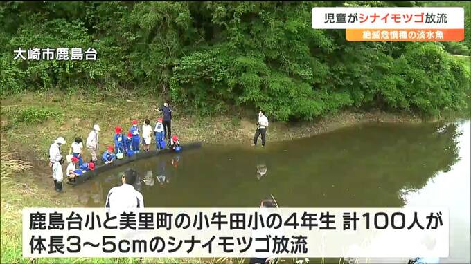 大崎市鹿島台のため池には、鹿島台小学校と美里町の小牛田小学校の4年生あわせておよそ100人が訪れ、体長3センチから5センチほどに育ったシナイモツゴを放流しました。