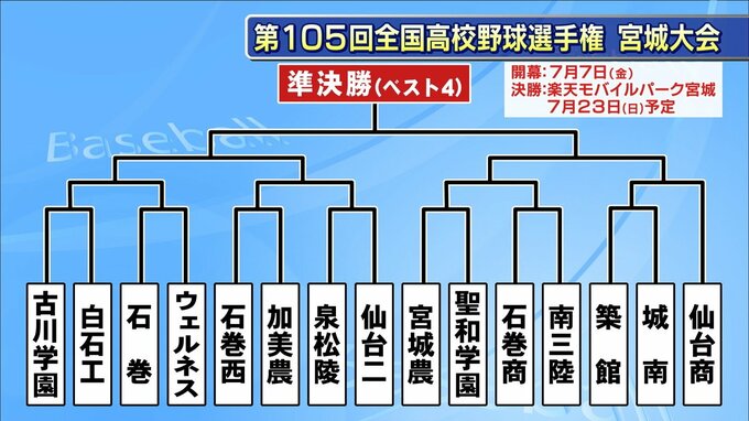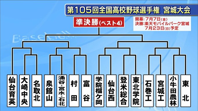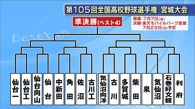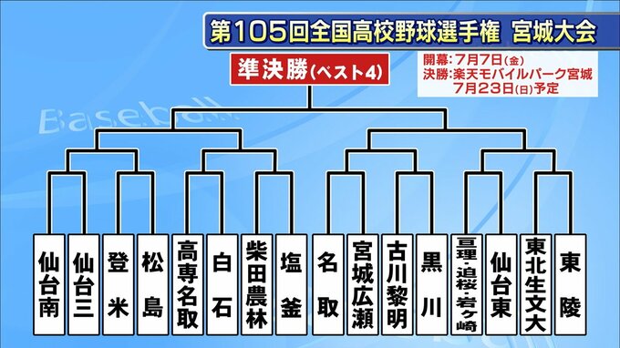 最後のブロック、一番右、春は仙台育英に敗れ準優勝となった仙台商業にも注目。以上計62チームが甲子園への切符をかけて県の頂点を目指します。