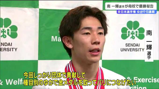 6月に行われた体操の全日本種目別選手権のゆかで5連覇を達成した南一輝選手が、母校の仙台大学を表敬訪問しました。